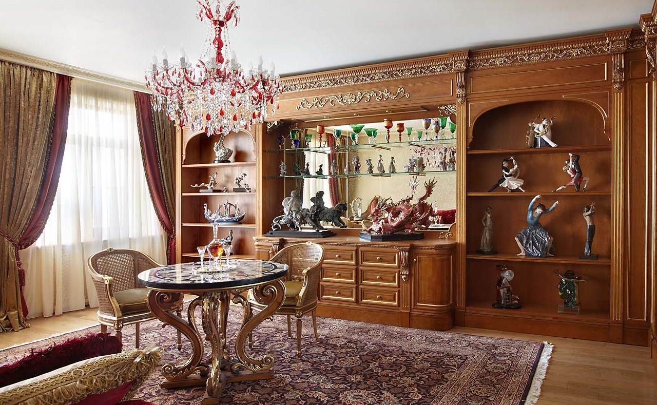 The classic interior creates an atmosphere in the house full of sophistication and harmony. The walls in the living room in a classic style are the main focus here. They combine beauty and functionality, emphasize the impeccable taste of the owners.