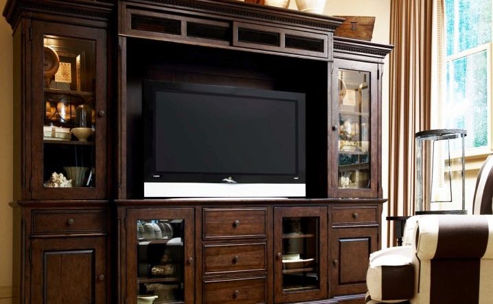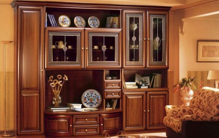 Any wall includes several sections in series. Each of them has its own purpose. These are cases, bedside tables, regiments, a bar, a compartment for the TV. Cabinets can be glazed or fully enclosed, single or double. In this case, the doors are swinging and sliding.