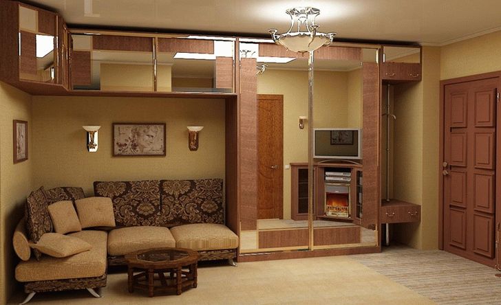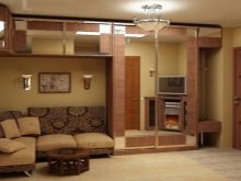 - With a wardrobe. A good choice would be a wall with a wardrobe. This option will allow you to accurately place all your belongings and the necessary items. In this case, the model can be located on the entire wall. This is especially true for spacious living rooms, where there is a lot of free space. However, in a small room, you can find a suitable option. The wardrobe will perfectly fit into the whole composition of the room.