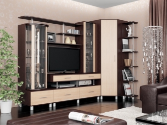 - Corner. Popular and popular are the corner models.They will perfectly fit into any space, helping to organize it successfully. Usually, the angles in the layout remain unused. Such a wall will help not only save space, but also create an attractive stylish look to the entire hall. At the same time, the products are quite roomy. Inside you can find a lot of shelves, cabinets, niches so that you can place the necessary items there.