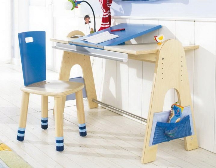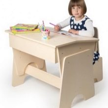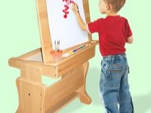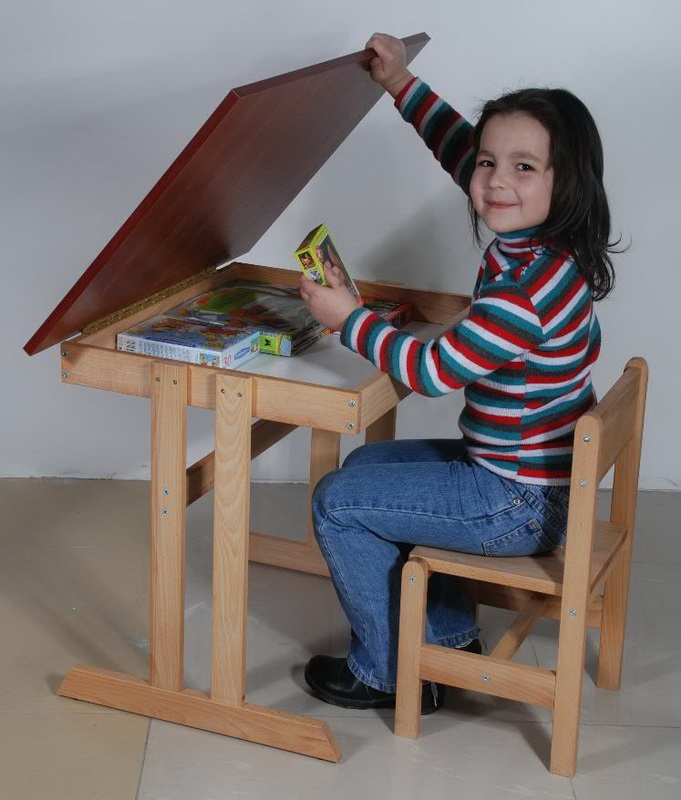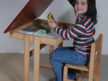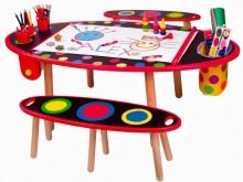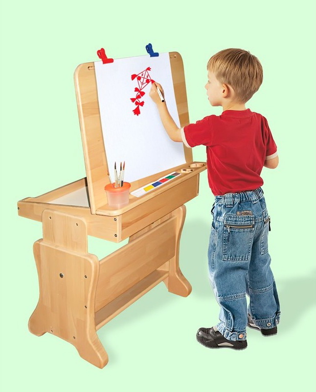 For practicing drawing certainly useful furniture. This is a one-piece design, which consists of a canvas-bench and a special footrest. For all the accessories of the young artist, special cells are provided. Basically, these desks are made of wood. Main advantages: