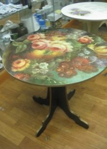To decoupage a plastic table, you first need to process the tabletop. Sand it, put acrylic primer. Then think about how you will have pictures. Make a small outline of their future location. Usually for decoupage napkins or drawings on rice paper are used, but for these purposes you can use any clippings and even images printed on the printer.
