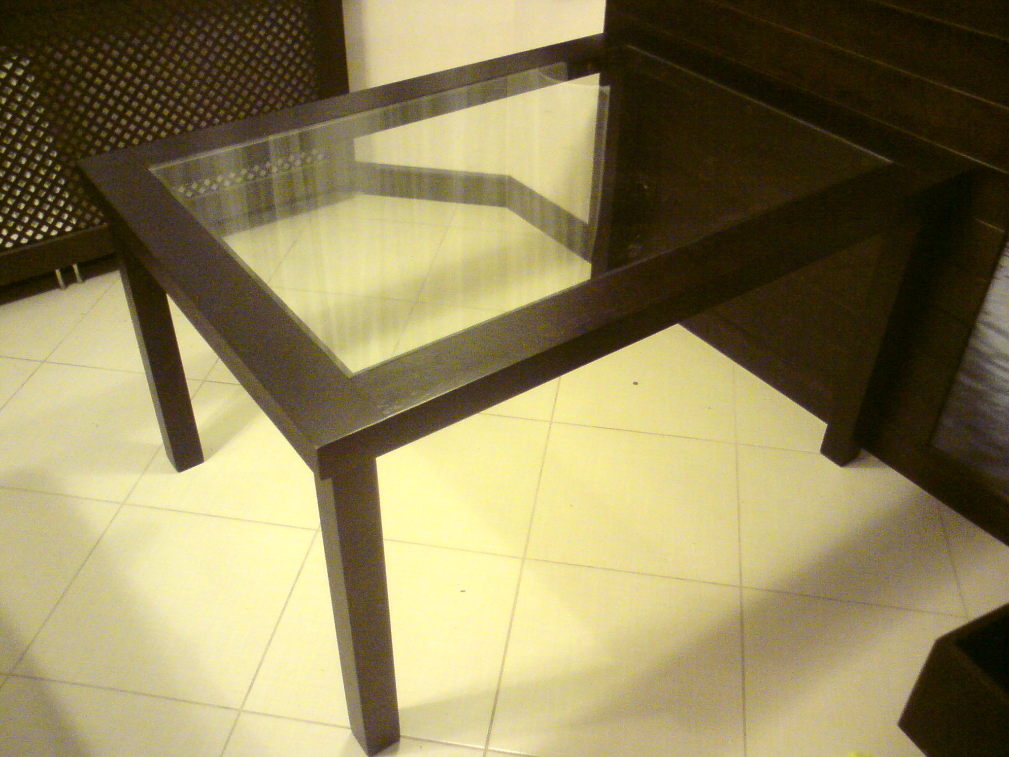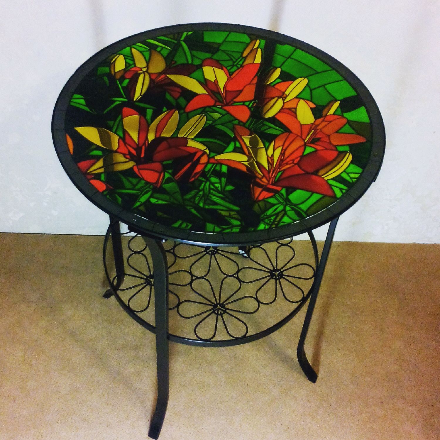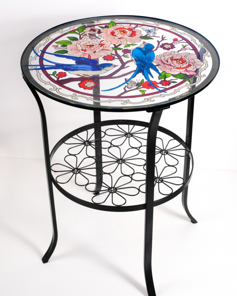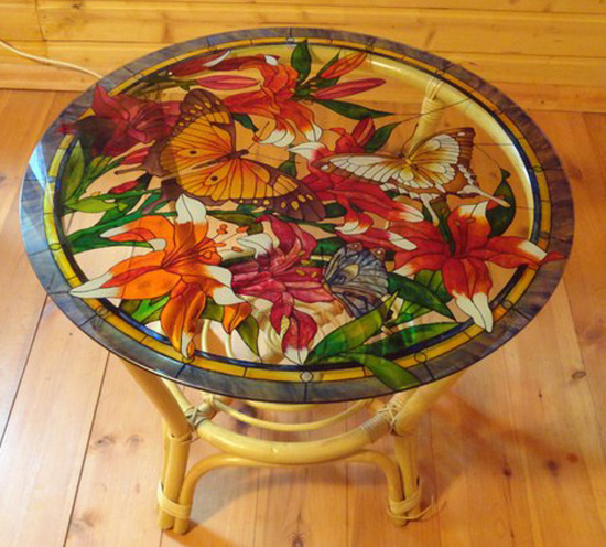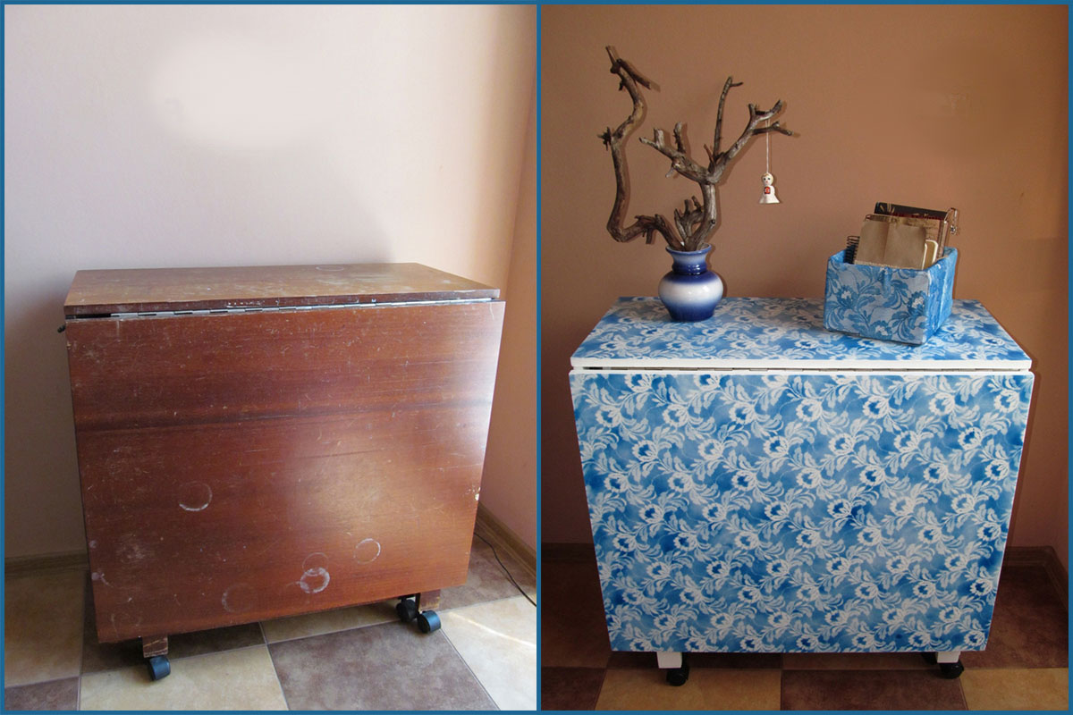 The glass table will have to be updated a little differently. It can be covered on the inside with wallpaper, film or decoupage.