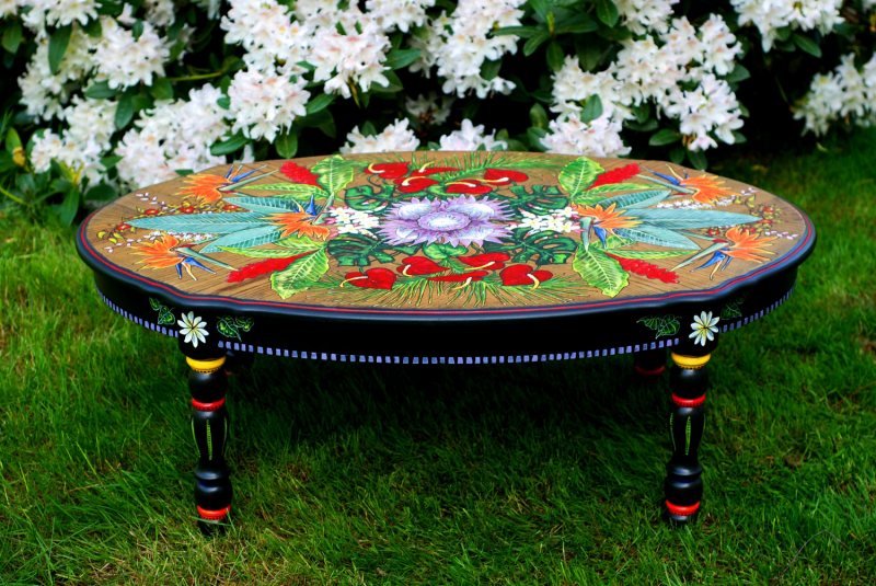 If the design allows you to make a mini-garden, aquarium or a bright composition of stones, shells. When the table has a small box that is covered with a table top, you can put a tray on its bottom and plant succulents there (plants that do not need frequent watering). Or decorate the box with shells, stones or other things.