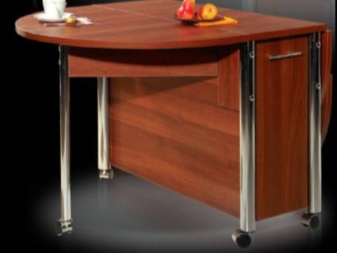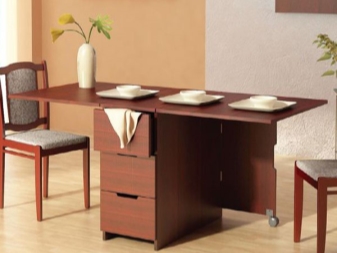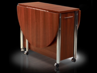 - Products on wheels. Due to the compact wheels that can withstand long loads, the table can be quickly moved from place to place. This model is easy to use. The surface of the product in folded form can be used as desired by the buyer. As a rule, flowers, photos and other decorative elements are placed on it.