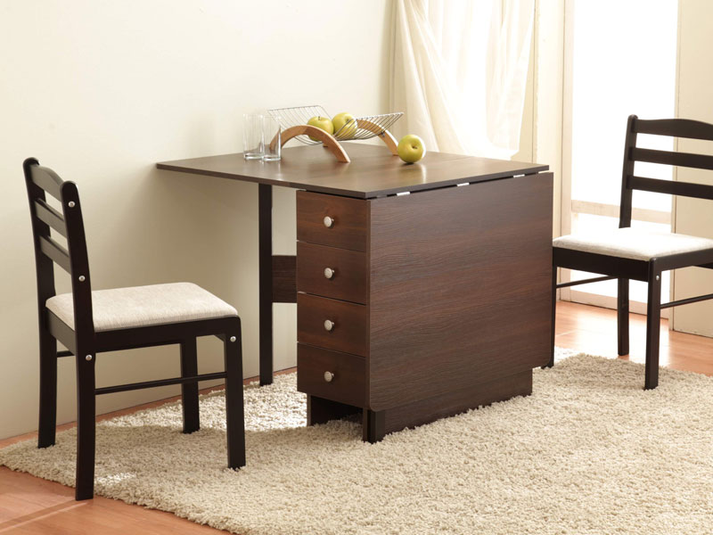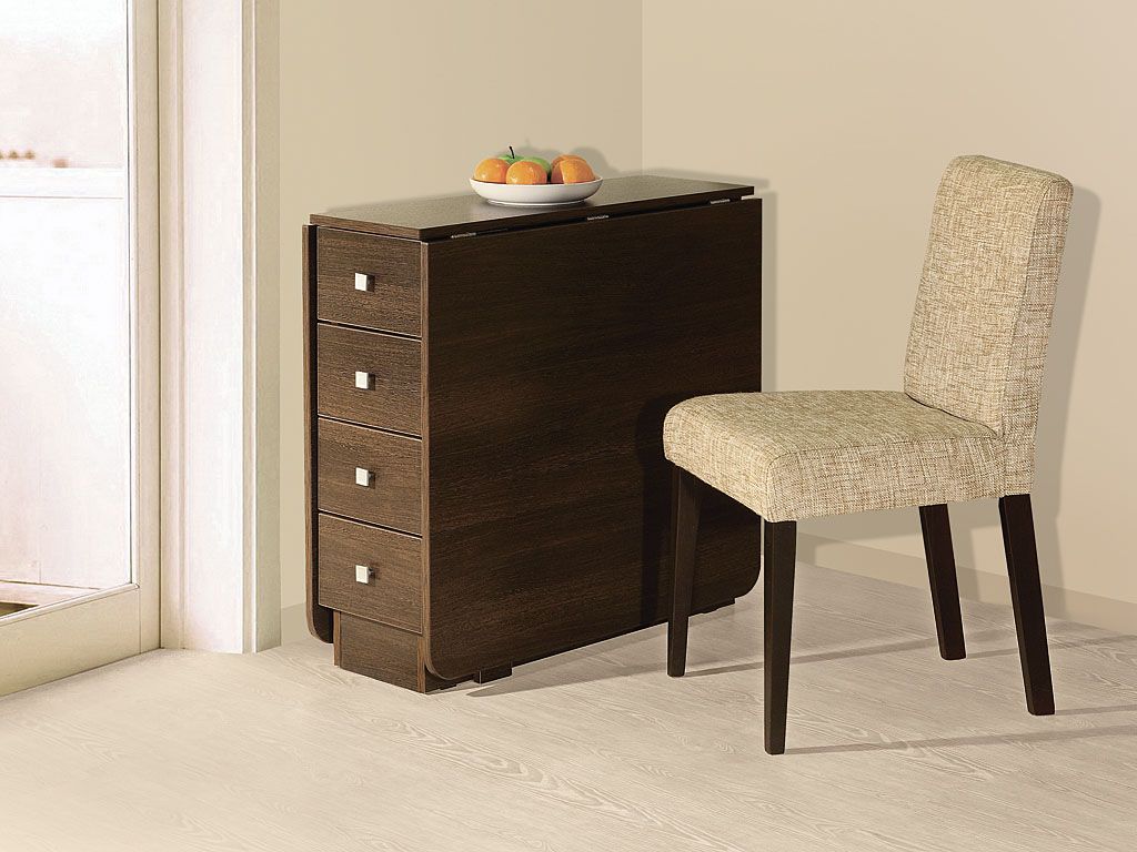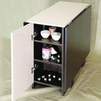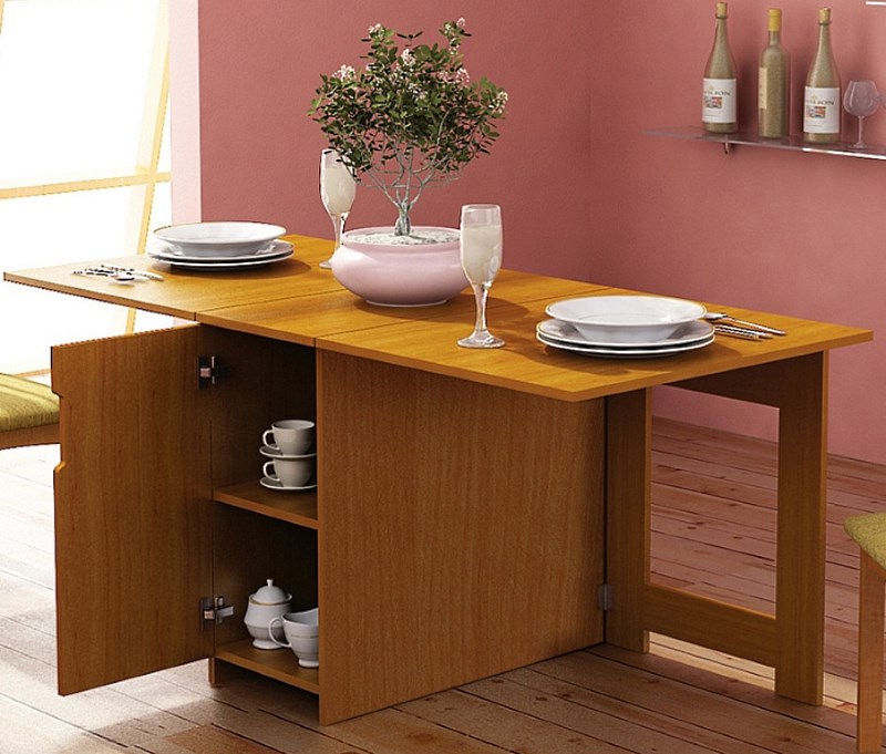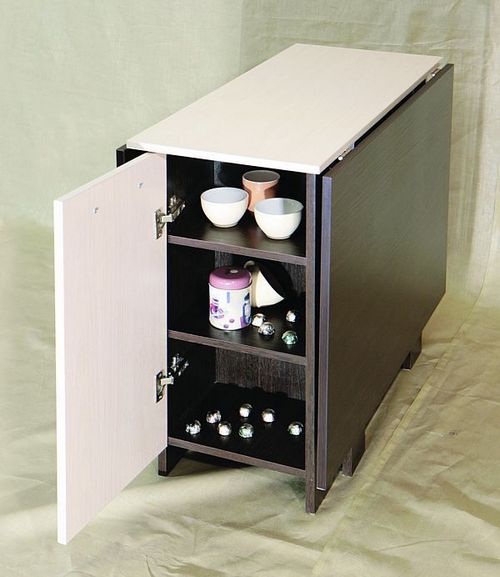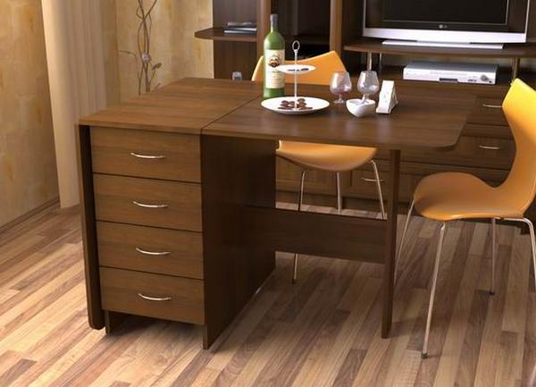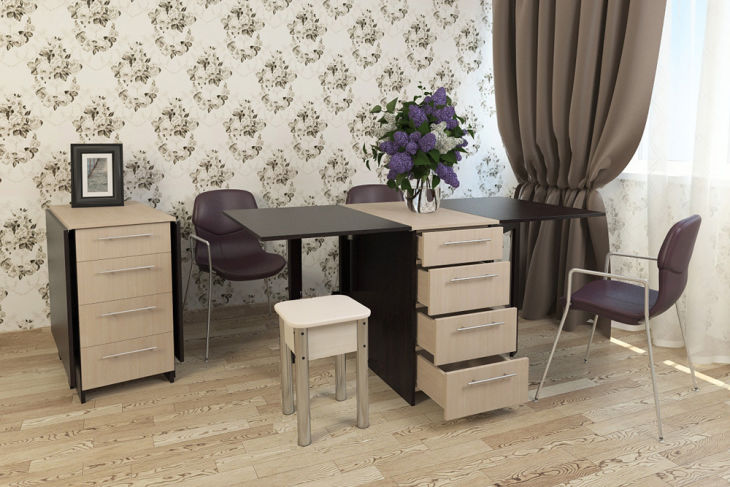 - Functionality. Furniture of this type can perform several functions at once. When folded, it is a compact and stylish cabinet. In the unfolded - a table for a large family or company. A product with drawers and shelves is a miniature cabinet for storing things that are necessarily present in any home, such as clothes or bed linen.