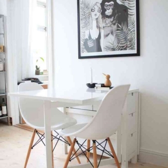 - Modernity. On the basis of modern style tables of the above format can also occur. Products from plastic, glass and metal will harmoniously fit into hi-tech or minimalism. Models with chrome legs complement the style of high technology. Given the huge range, it will be easy to choose the right option.