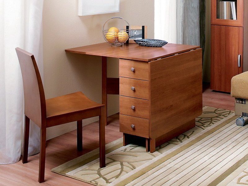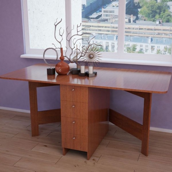 A table-book with shelves and drawers is practical, comfortable, compact furniture that can be used both in folded and folded form. Due to the special design, the product practically does not take place in the house. The table of this type will be located in any room.