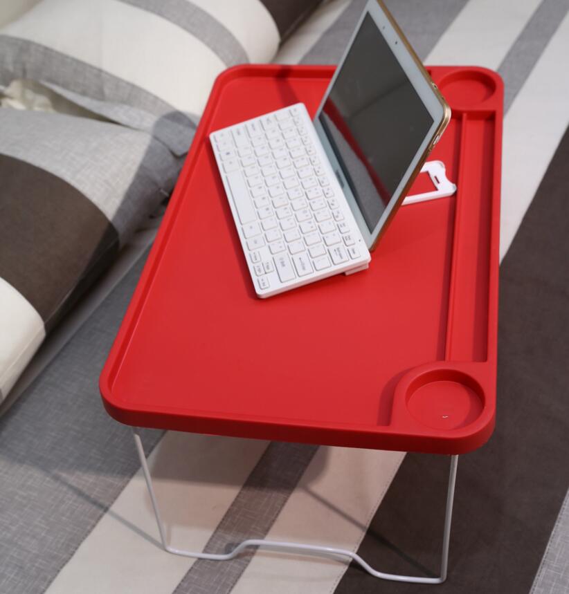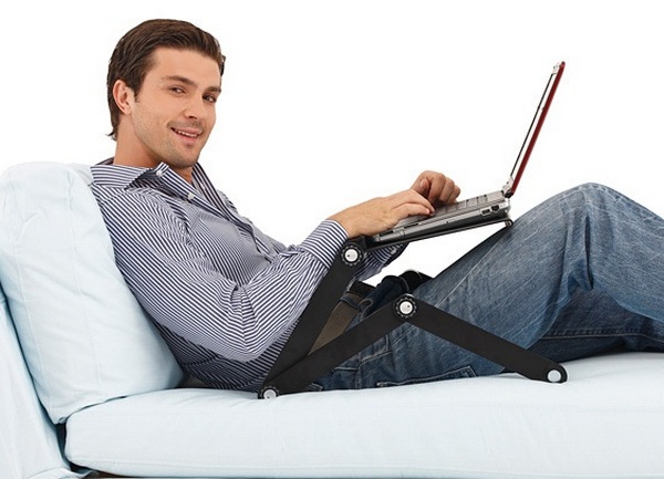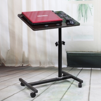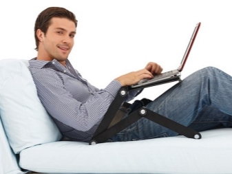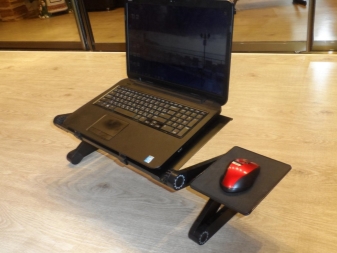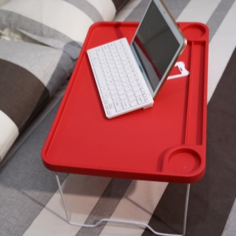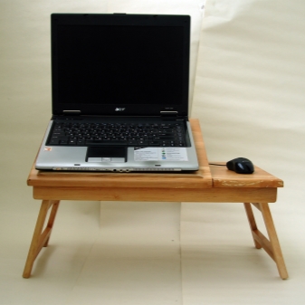 According to their design and functional features, small-sized laptop tables are divided into several types. The most popular is a bed-table stand. This model has short legs and a wide work surface, in which the tilt angle adjustment is sometimes provided and there is a recess for the cup. The product is intended for work at the computer in a prone position or sitting.