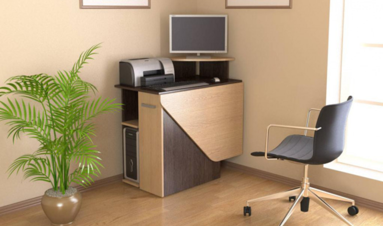Retractable shelves and add-ons allow you to place the printer, scanner and speakers, and a sufficient width of the working surface will provide an opportunity to use a computer mouse.