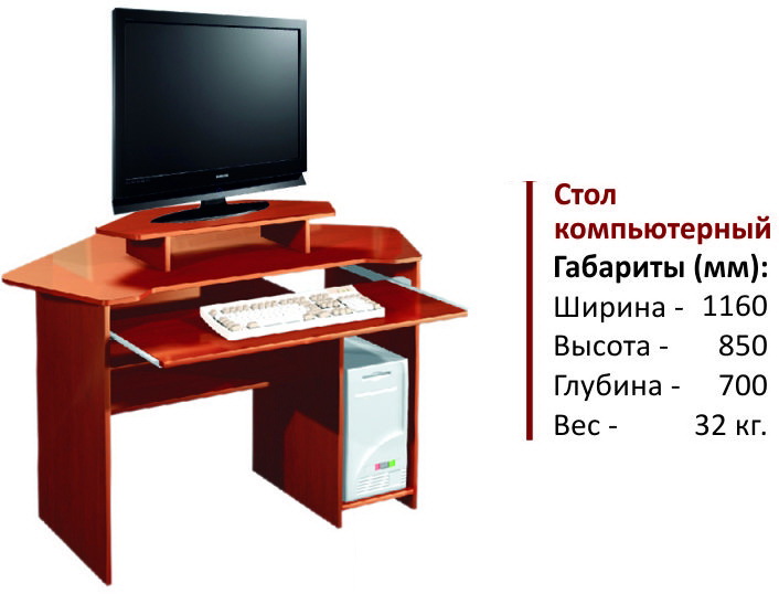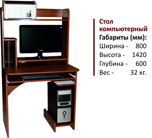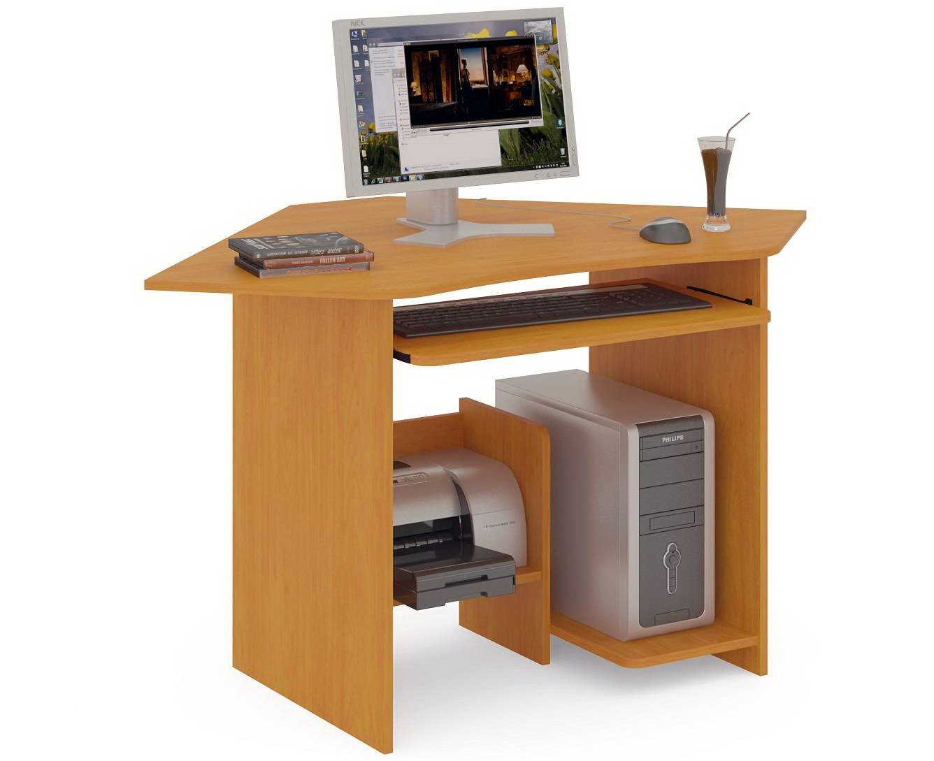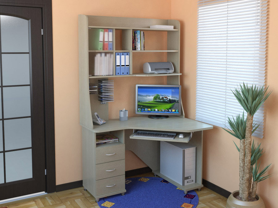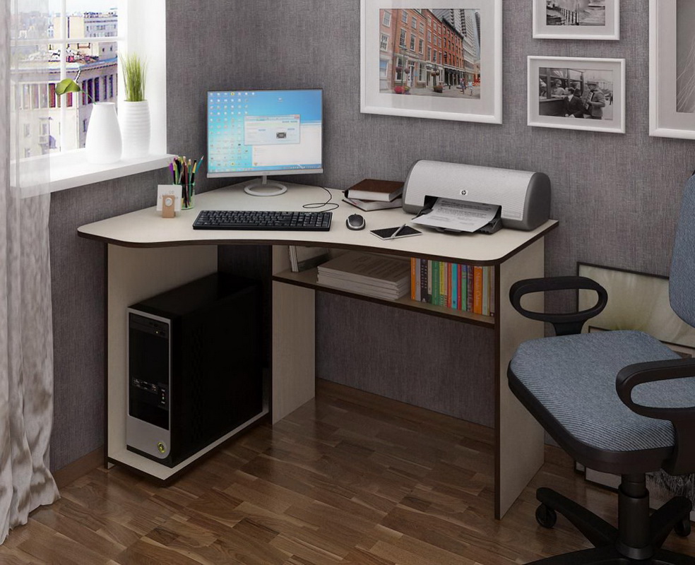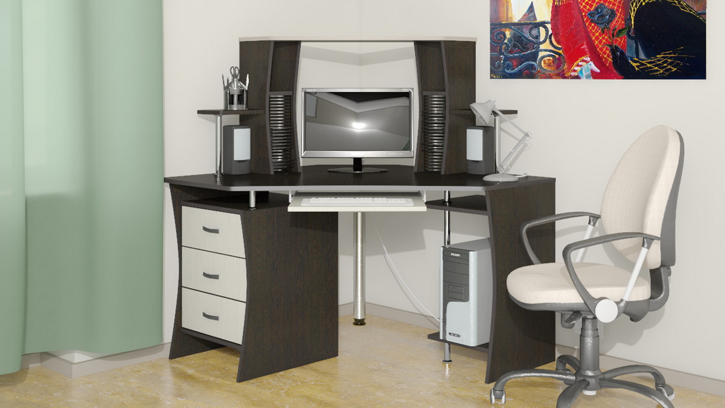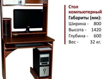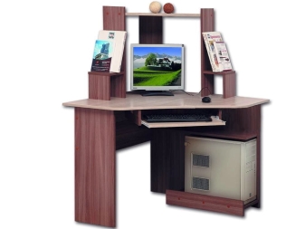 - Model from the factory "Falcon"classified as simplified but compact "Russell". The shape is trapezoidal, there are no superstructures, the sidewall is sufficiently long - 90 cm. Although the table is small in size, the shape ensures its good capacity,thanks to separate compartments for the system unit and a separate location for the printer. There is a movable shelf for keyboard and mouse. The price of such a table is 3200 rubles.