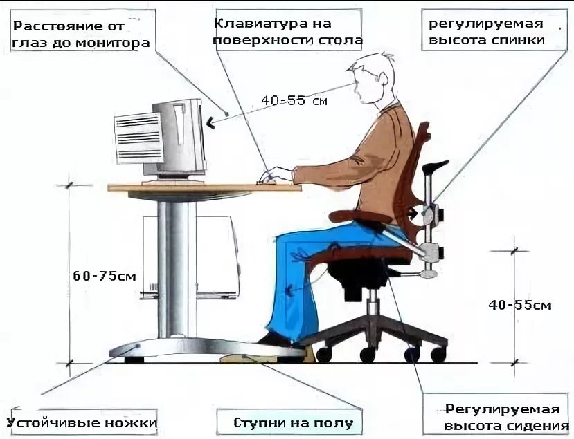 The body should be in the following posture: straight back, forearms are relaxed and freely placed on the table, shoulders not raised, muscles relaxed. At the same time, the legs should be level, fully touching the floor sole.