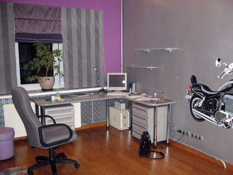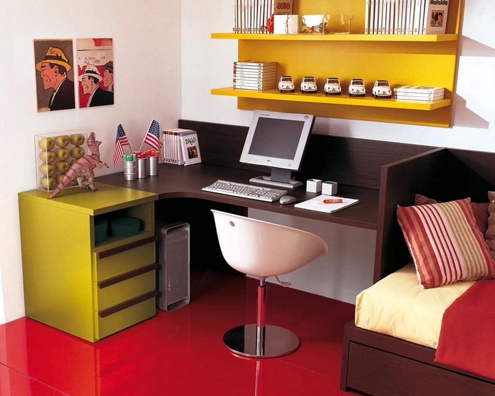 - Diagonal-perpendicular arrangement - the face looks towards the corner, but you can always turn around to the wall or towards the window, that is, perpendicularly. Tables are quite large in size (at least 130-140 cm in each direction). But functionally they are much higher, you can equip the workplace almost completely.