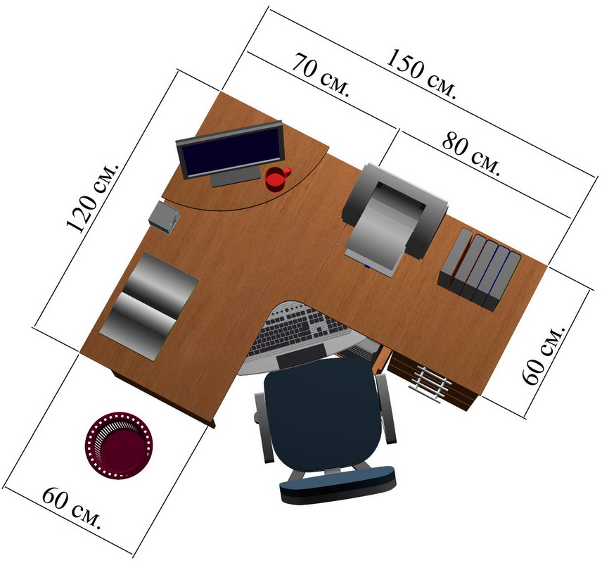 - The monitor should be located at a minimum distance of 50 cm from the eyes. It turns out that the tabletop should have a width of not less than 60 cm, and 50 cm is already a strong violation and deviation from the norm. In the corner tables, this condition is much easier to fulfill, because the user ultimately is still in this “triangle”.