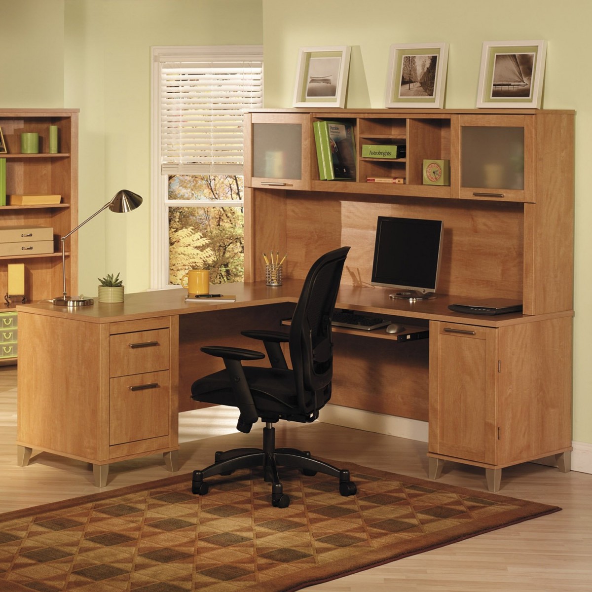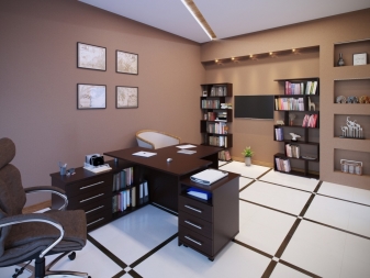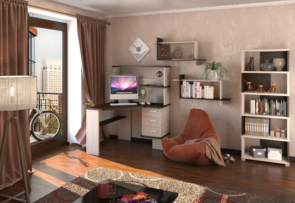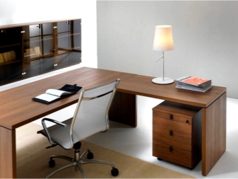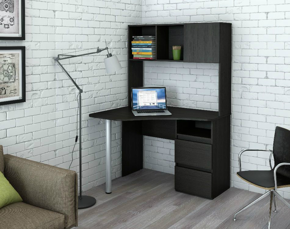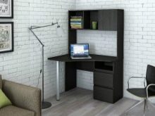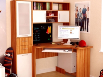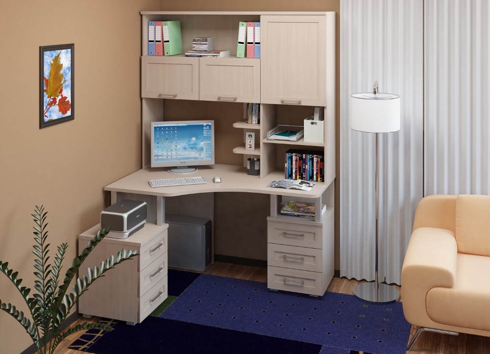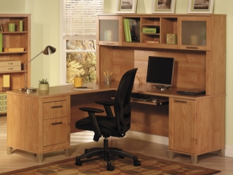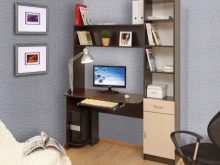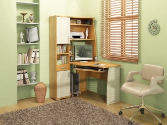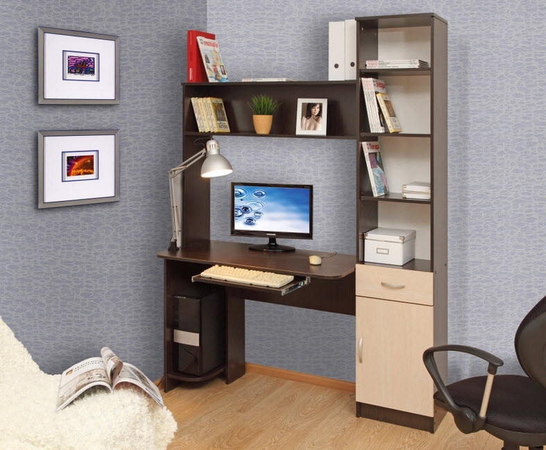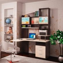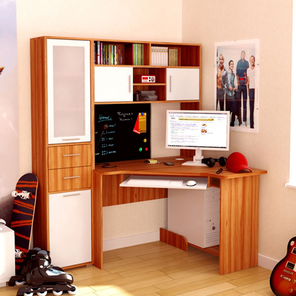 Another way to save space and get a large tabletop is to choose a corner table. Options for the execution of the corner tables for the computer and the letter at the same time very much. The monitor is usually placed in a corner, and the straight part is intended for reading and writing. The upper superstructures occupy the writing zone, and the lower cabinets and cabinets can be located on both sides.