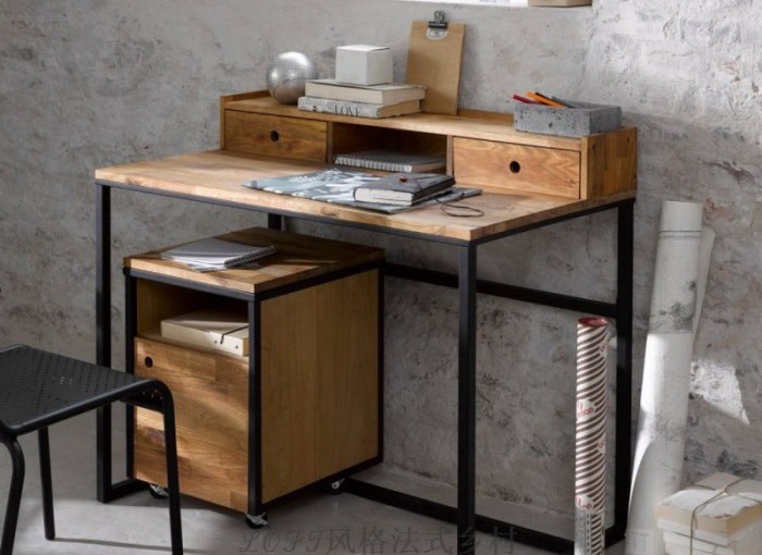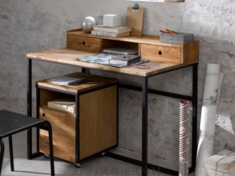 - Due to the popularization of loft-style, manufacturers tend to conquer the market segment in this direction. Metal tables in combination with a wooden tabletop now occur quite often.Such an industrial-type construction is unusually combined with household objects such as flowers, textile decorations (pillows, carpets), personal photographs, and books. A metal ensemble consisting of a table and several shelves is an excellent variant of a computer table with add-ons in the loft style.