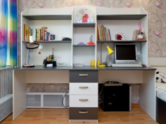 Thus, two small worktops will be separated by a pencil case or open shelves, or the table will have one sufficiently long tabletop so that the activity does not affect one another. The design may have a built-in character, thereby acquiring a complete look.