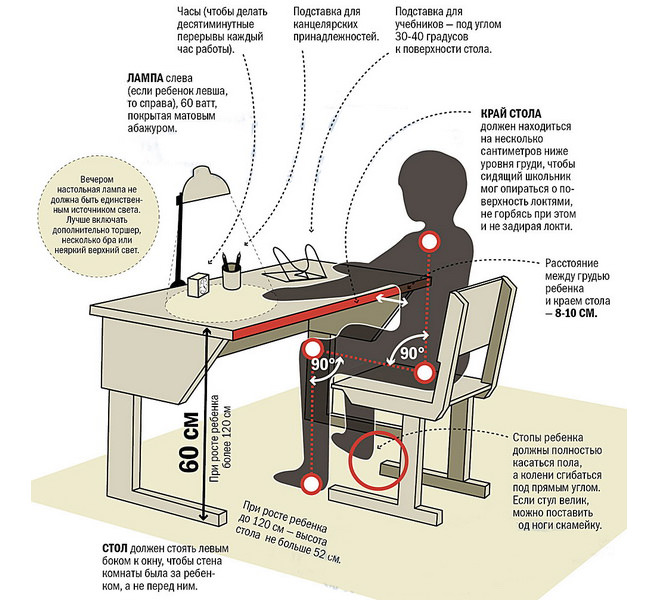 - The length of the table top. In the same position, place your hands as if you are writing something, the hand should not hang down. Thus, the minimum size of the writing area for a child is 60 cm, for an adult it is 80 cm. Wider countertops are preferable, since they allow you to place the necessary equipment.