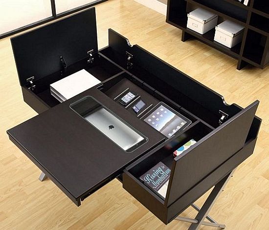 Transforming tables have become an interesting solution. with folding or sliding table top. A shallow box with shelves and small cabinets is hung at the required height on the wall with the help of special fasteners. At the right moment, the tabletop is simply extended and used for its intended purpose. The rest of the time - it's just a wall module, which has a place to store and to accommodate the decor.