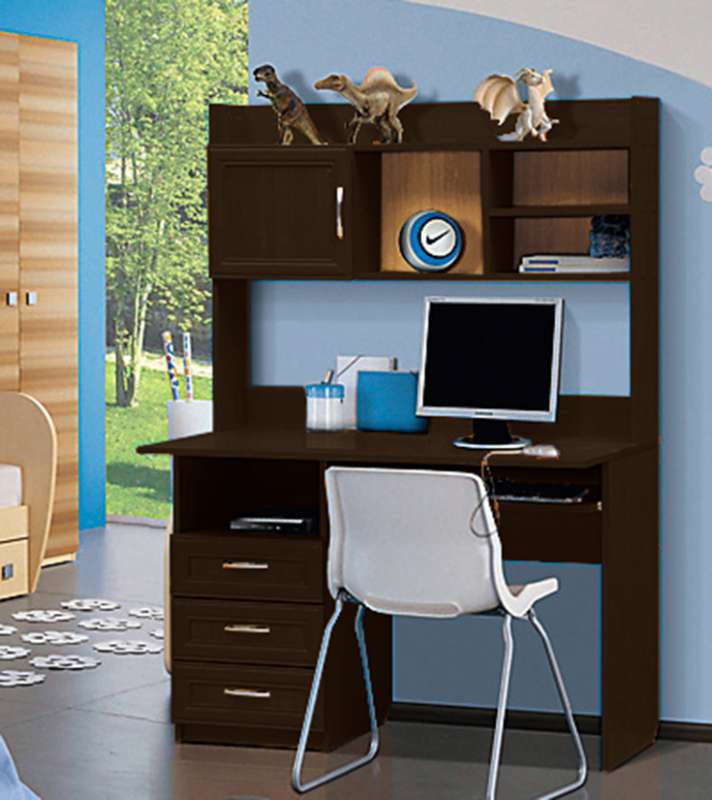 For mobile young people who have already learned, it is preferable to have a small table that will be designed only for a monitor with a keyboard and mouse or for a laptop.The minimum set of add-ons for such furniture: an open top shelf, in the form of an extension on a computer desk, cells for disks, a sliding table top under the keyboard. But the table, for example, with a mobile pedestal will allow you to organize space for storing paper, DVDs, wires and other things.