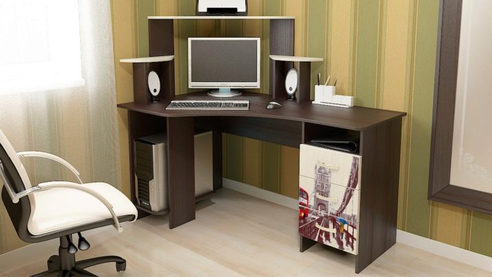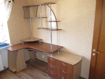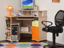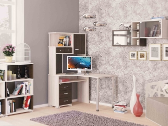 Corner tables with racks often opted for home office. Having selected the height of the rack, the shape and number of shelves, you can place on it all the folders with documents, books and other necessary things. On the shelf shelves can get a printer and speakers. In the corner there is a place and a computer desk with thumbs, which also fit a lot of things needed for work or study.
