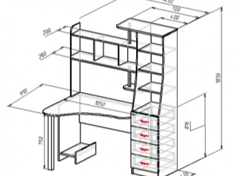 The minimum length of the side table top of small diagonal tables is from 80 to 90 cm. Such dimensions solve the problem of the location of the main components of the computer, as well as additional devices. The height of add-ons can be almost any, provided that they do not close the window. The most efficiently used space is located at a distance of just over half a meter. The shelves above are usually filled with items that are less commonly used.The greatest length of the side table tops is about 120 cm. Usually, shelving is mounted on the side.