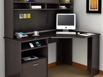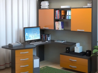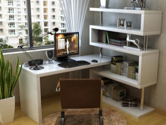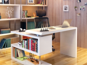 Options with racks also depend on the type of table. The symmetrical design of corner furniture with diagonal placement is convenient for numerous shelves for storing document folders. You can choose a rack, supplemented by sashes at the bottom. At home, such models are rare, in offices they look much more organic.