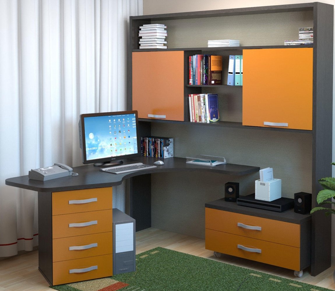 Options for corner tables for the computer set, therefore it is possible to embody practically any idea for the most different premises. The possibility of additional selection of cabinets, shelves, drawers, wall cabinets makes the tables different from each other. In add-ons you can store all sorts of stuff and the necessary gadgets.Hinged cabinets allow you not only to unload the tabletop, but also to hide from prying eyes everything you work with.