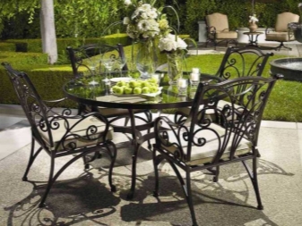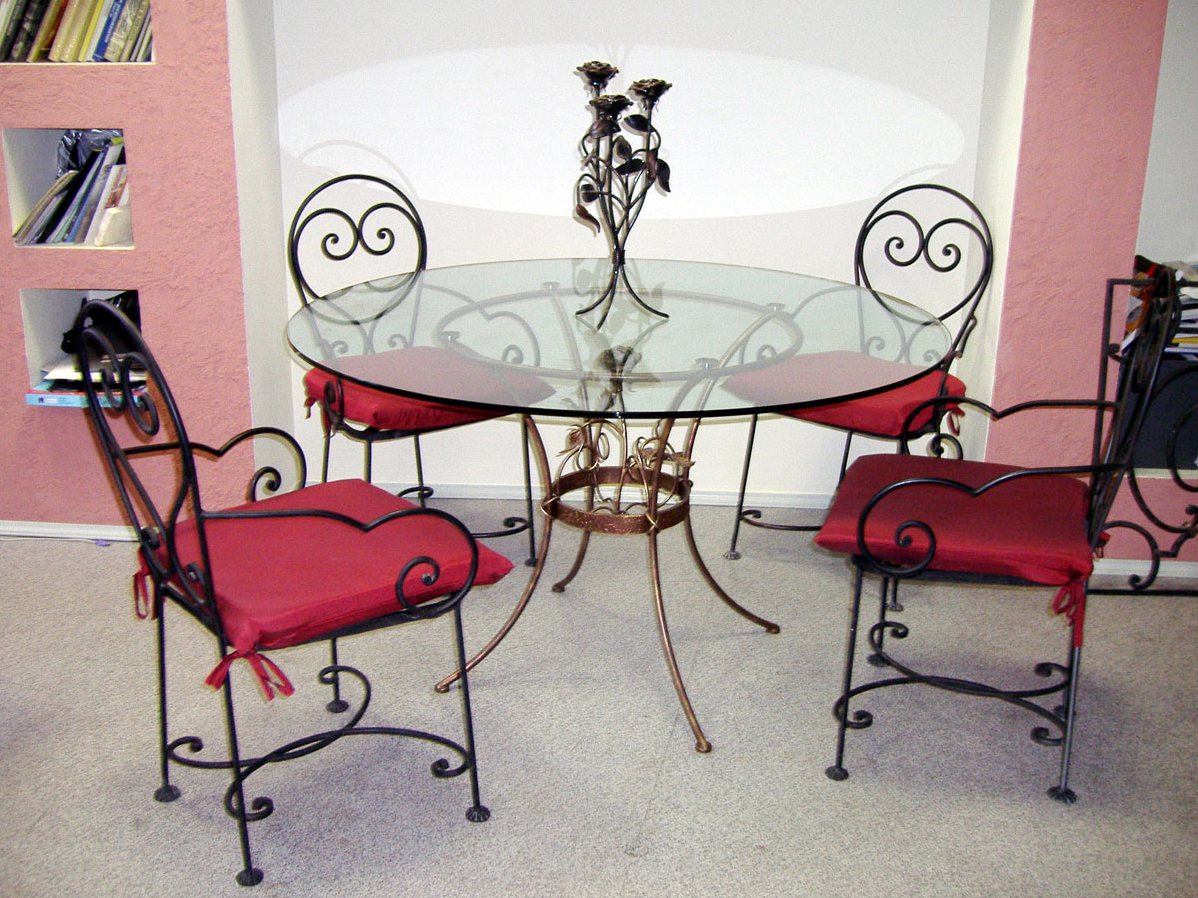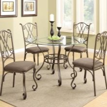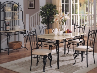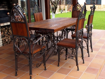 - The table, as a rule, does not stand by itself, chairs are attached to it, and if the table base is metal, then the supports of the chairs must also be forged.