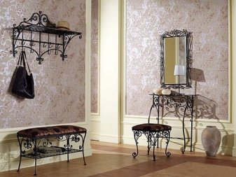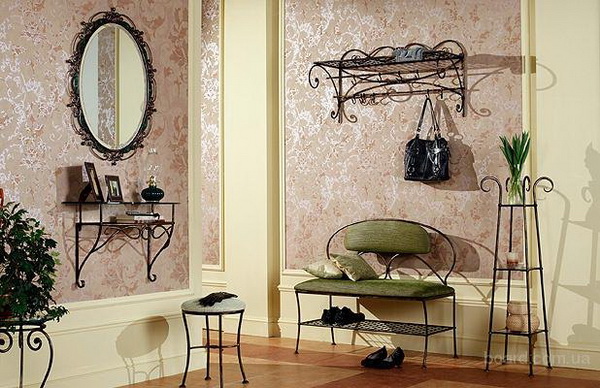 More than in any other room, forged parts can be placed in the hallway. A table with steel legs, a mirror in a metal frame, a suitable hanger, a stand for umbrellas, a bench, a shelf for shoes - all these items can be forged. The interior is sure to transform.