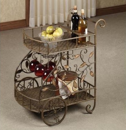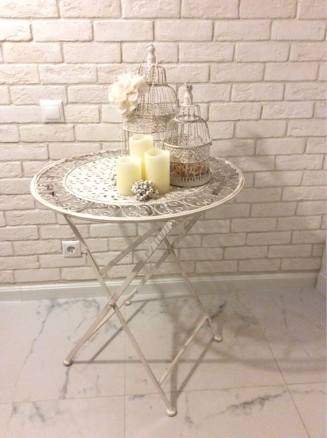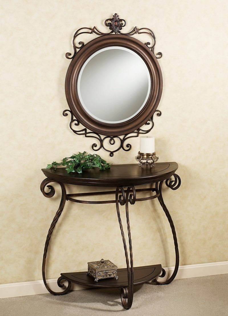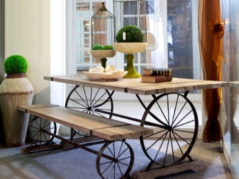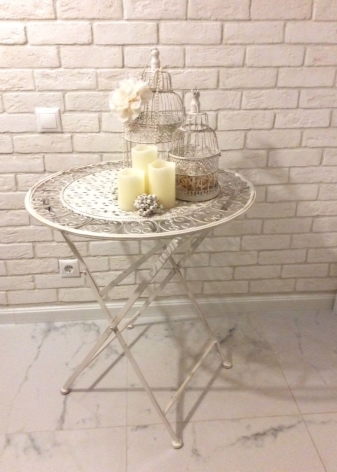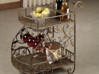 A small wall table with elegant wrought-iron legs can be installed in the hallway. A small table with forging on wheels can be used as a coffee table.