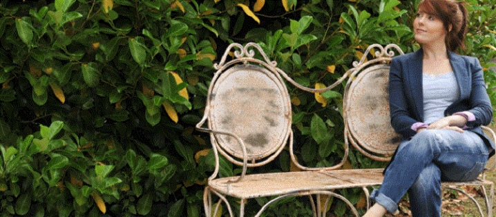 - A rectangular table for tea parties can be placed at the massive representative bench with metal elements in the back and wrought iron armrests.