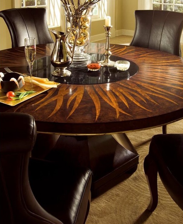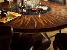 A wooden table, in the center of which there is an original rotating podium, will make any dwelling more attractive. For such furniture will be very nice to sit. On the podium often put up different dishes, to reach them will be able to anyone who wishes, simply turning the stand in his direction.