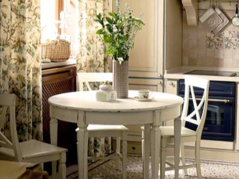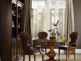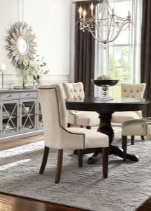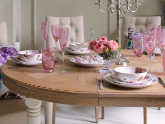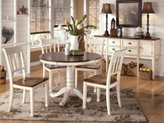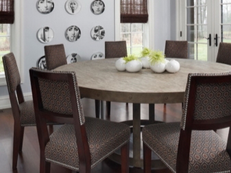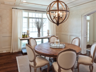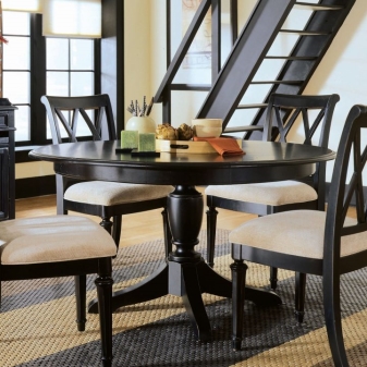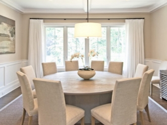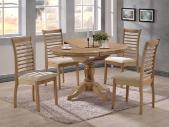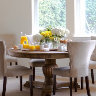 A round wooden table can be the main element of the kitchen or dining area in the living room. Such furniture can be a place to gather the whole family for family council, for tea drinking or just for an evening pastime. A stylish chairs complement its appearance with its elegant options.