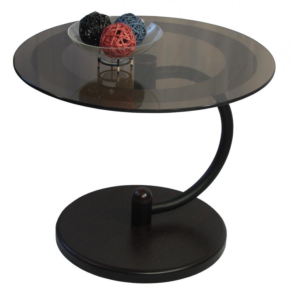 Round coffee table made of glass and metal. The originality of this design gives a curved leg, which makes the tabletop almost soaring in the air.