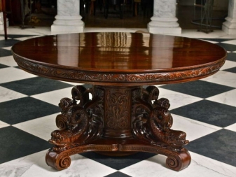 Very seldom there is a round living room in the interior, and it is especially good for her to select constructions of the same shape. But in this case it is important to choose a product with a thin table top and a small support.