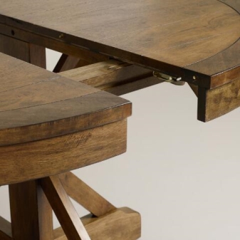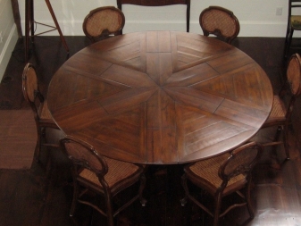 - Very often for the manufacture of round sliding table tops used veneered chipboard or MDF. It stands out for its practicality, ease and democratic price. Externally, the construction of these materials look like natural wood, and therefore favorably emphasize the luxury of the interior.