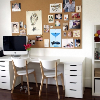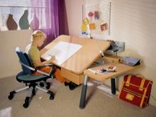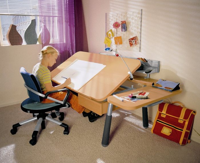 If there is an opportunity, then it is better to take furniture with a large tabletop and a working chair on wheels. For younger students, the chair should not be spinning, it spoils the posture, but the wheels are very comfortable when the child moves from a written workplace to a creative one.