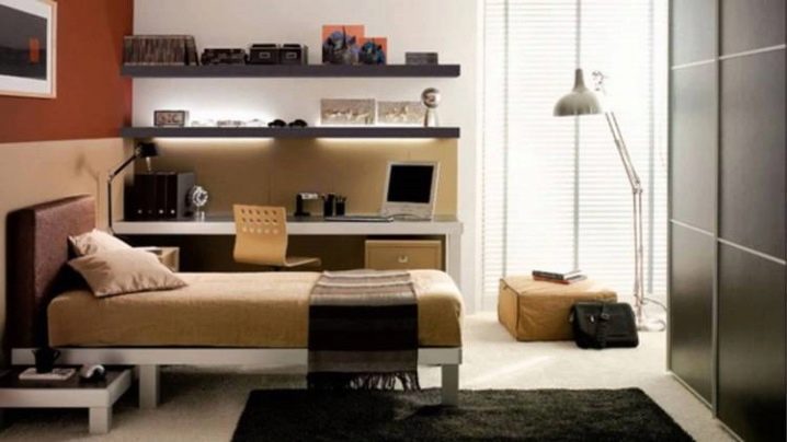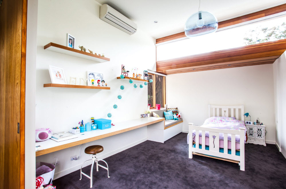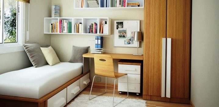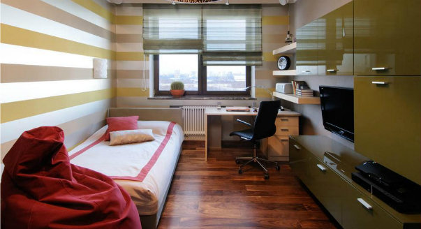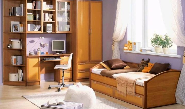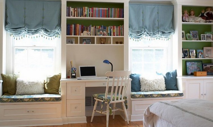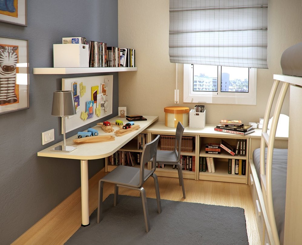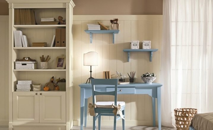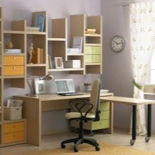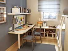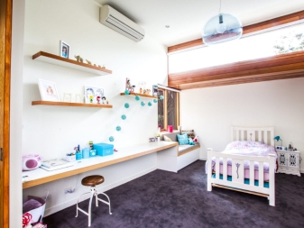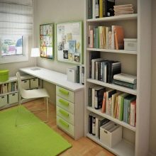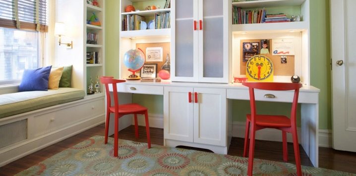 One of the most stylish design options for the workplace of a schoolchild at home can be considered a tabletop built into the overall scheme of cabinet furniture. In this case, the furniture does not stand out visually and does not divide the space into parts. Part of this concept can be considered one large tabletop in the entire wall. The storage system in this case is represented by mounted or built-in shelves with and without cabinets.