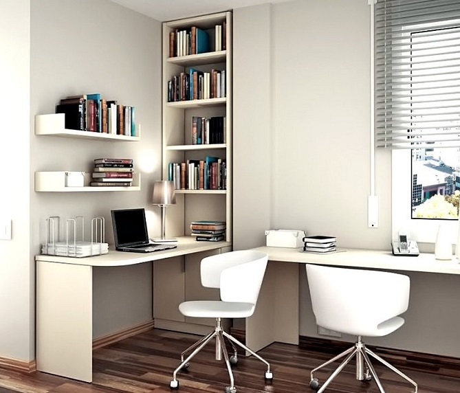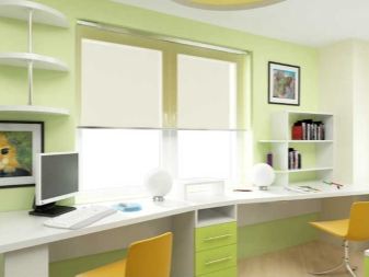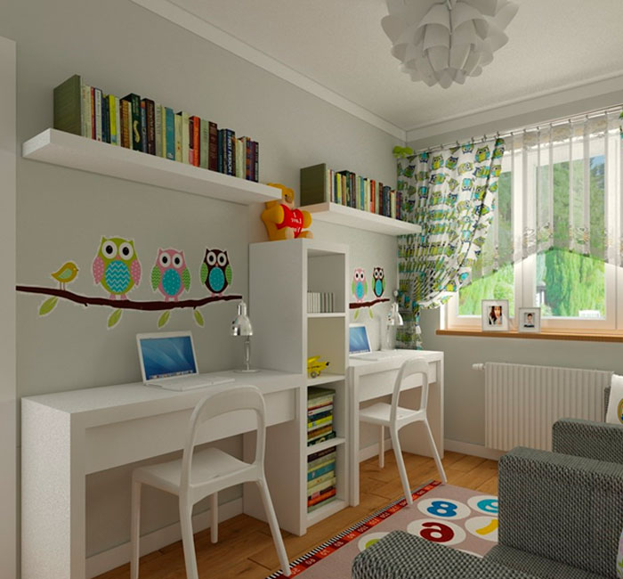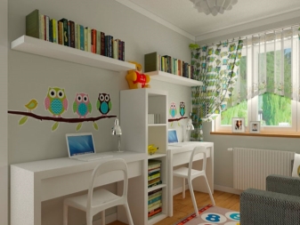 The workplace for two children is better to be divided not only by the nightstand with bookcases in the middle, but also to make two separate tabletops. This clearly delineates the space, relieving tension in the subconscious, where children mentally divide the territory.In the neutral zone it is best to install two clocks facing in different directions.