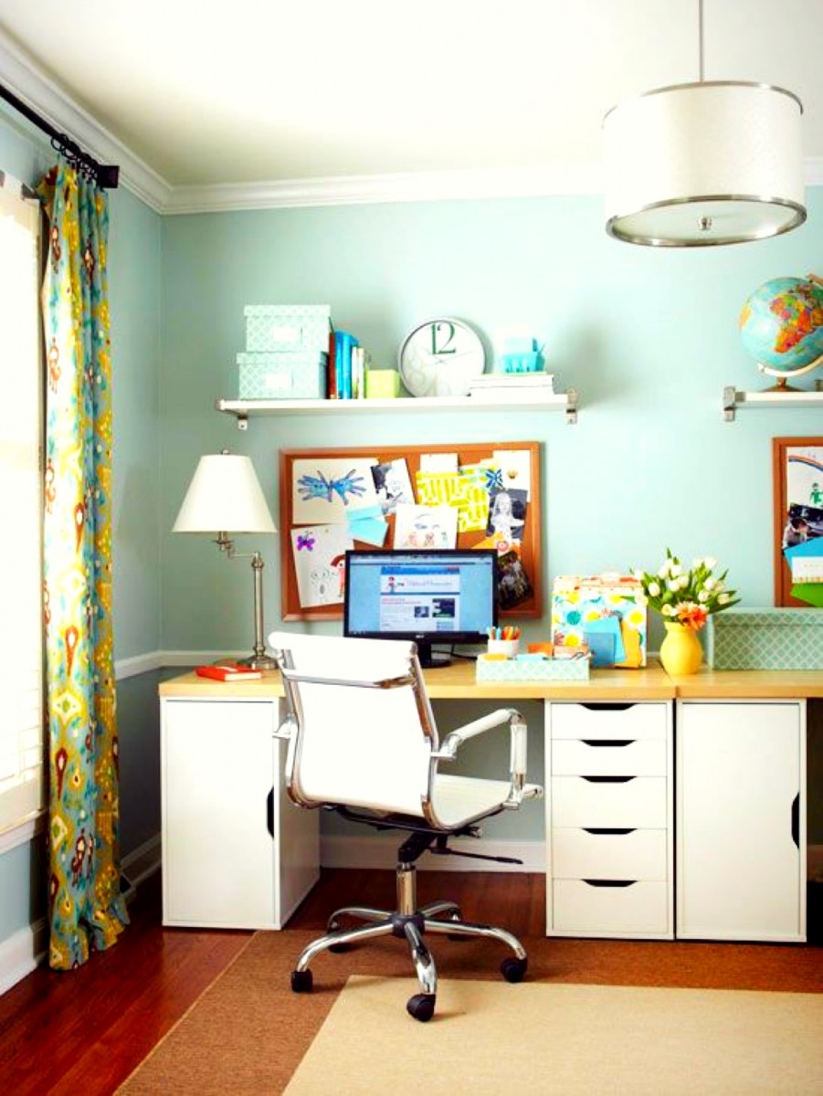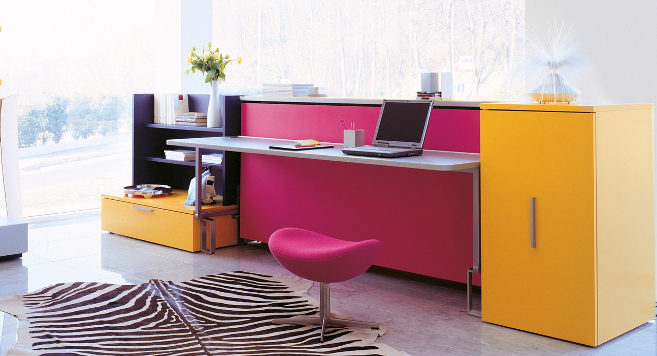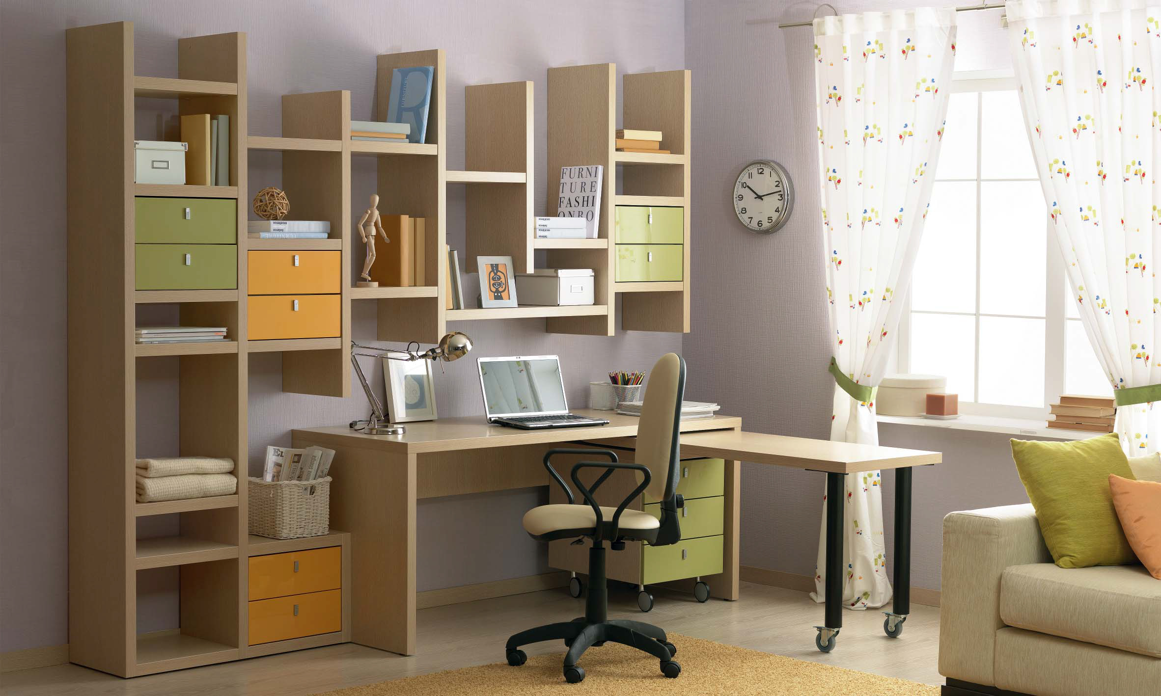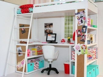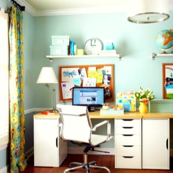 Table with built-in shelves can be decorated with neutral mirror stickers in the form of flowers or geometric shapes. An excellent decor option will be the multi-colored design of the back wall of the shelves. The space in front of the desk is better to arrange a smooth plastic panel for gluingpieces of paper or hang there a large corkboard with buttons for the schedule.