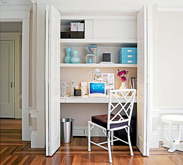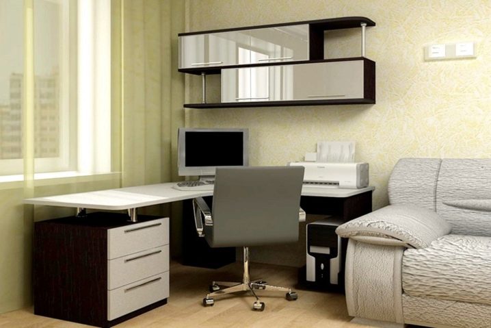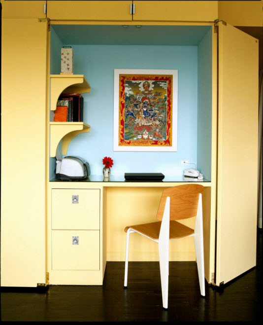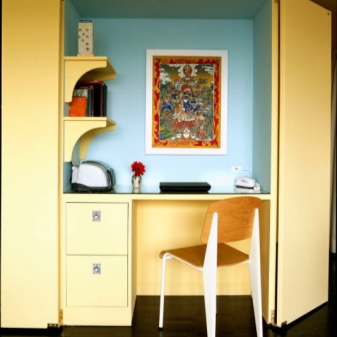 The most original version is the creation of a working area in the "cabinet". If the workflow is not completed yet, but friends came to visit, the doors are easy to close, thus hiding the creative mess from prying eyes.