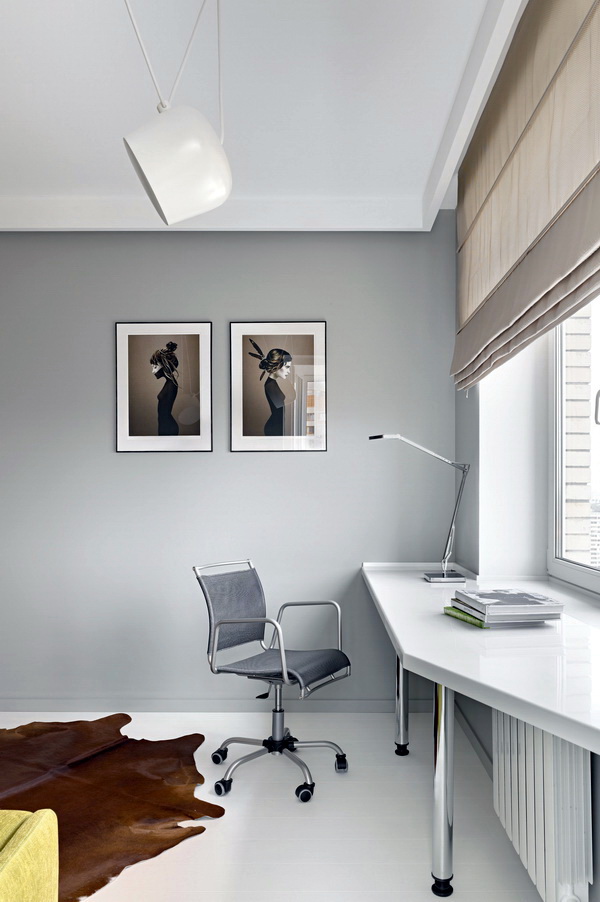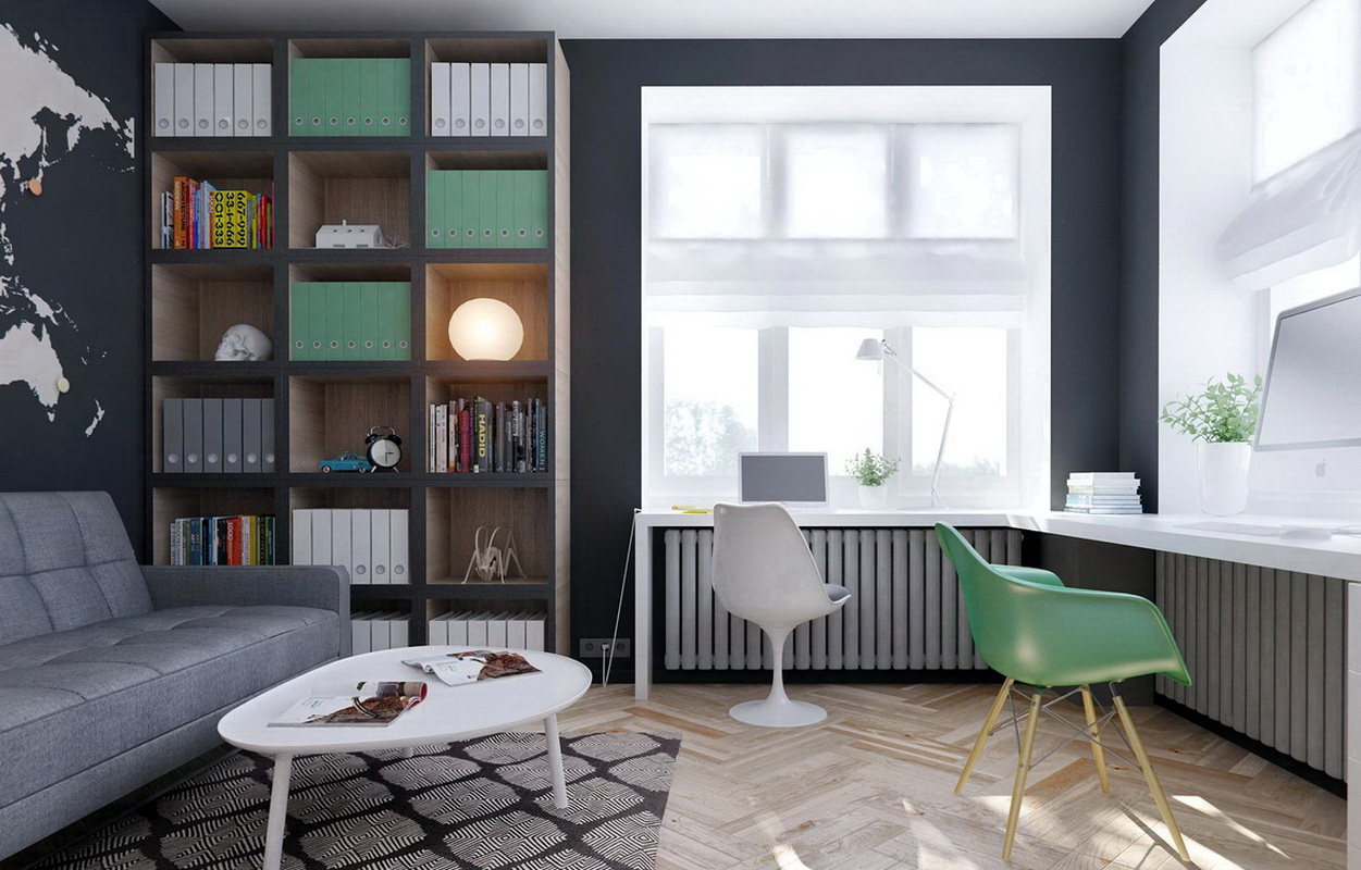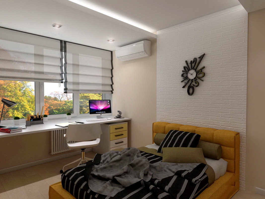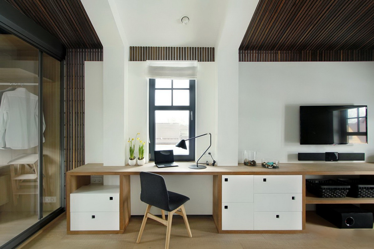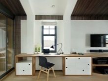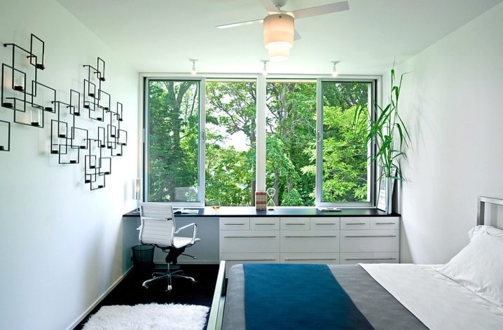 A stylish table on the whole wall in the interior of the bedroom successfully separates the working and recreation area. The pull-out version of the drawers under the table top allows you not to litter such an intimate place in the apartment with working documentation.