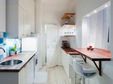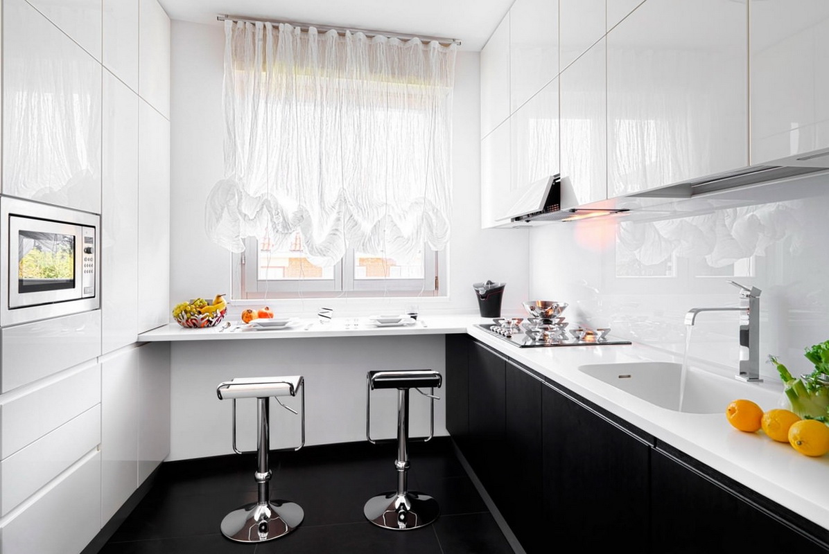 A variant for a small-sized kitchen can be a dining table-sill, combined with the working area. Such a continuation can be considered successful for a family of two people.