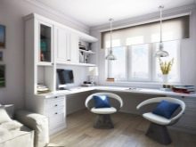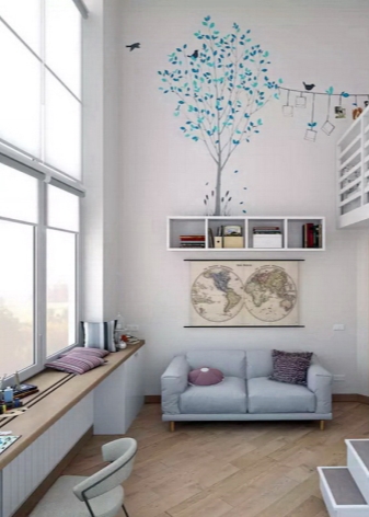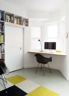The window sill with the tabletop in the living room is made whole, without the possibility of folding. The models here are a continuation of bookcases or part of the wall, where TVs or computer units are nestled. The width and length of the table tops is small, because in this area there are already many other important areas. In the hall, a small stool on wheels is attached to the model, allowing it to be quickly moved to another location if necessary.