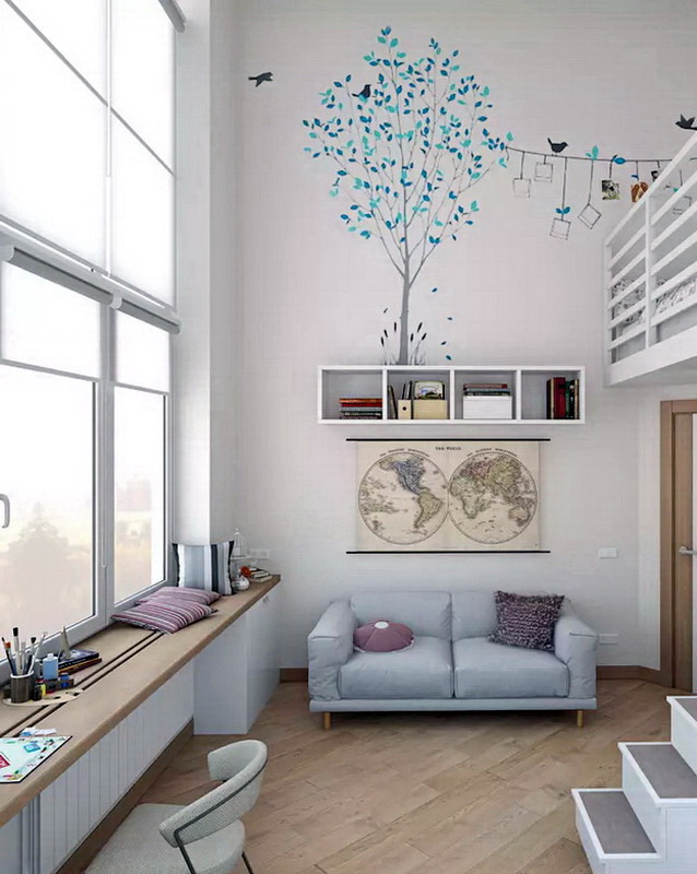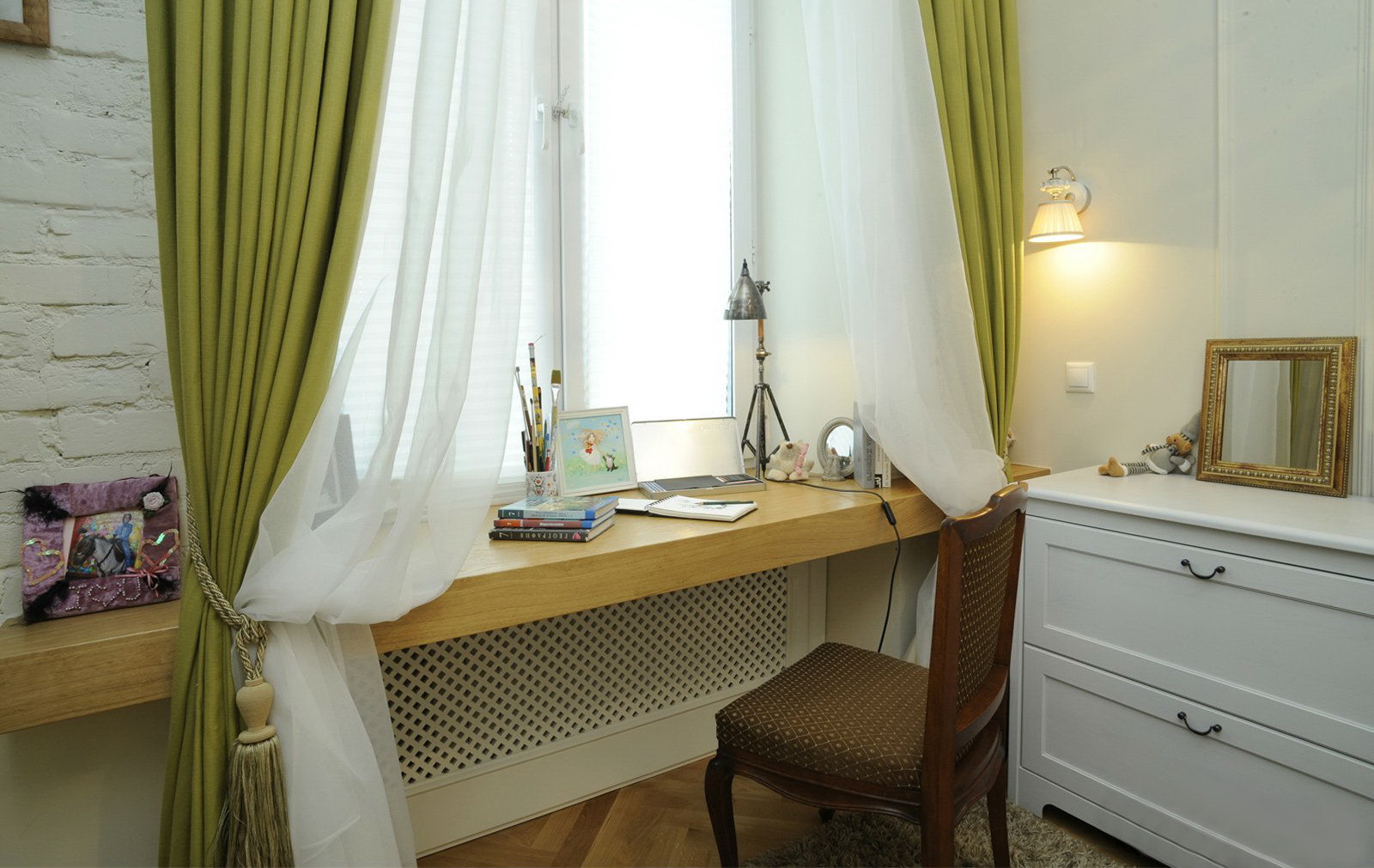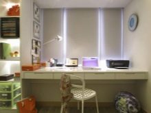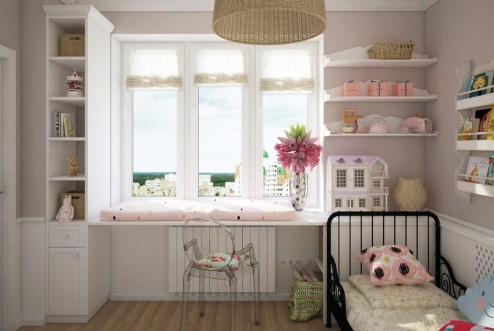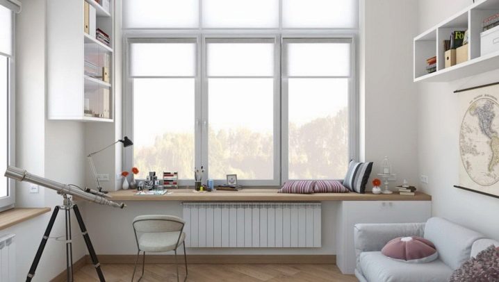 Tables-window sills differ significantly from each other depending on the territory on which they are located.For example, a model for a preschooler’s children's room is characterized by smooth, wavy lines with no corners. The table top in this case occupies the entire wall and has several open shelves for storing books, pencils and drawing albums. To ensure that the children's room is safe, the tabletop is made whole, without the possibility of folding. Also, for it allocate sufficient width for a comfortable arrangement of toys. Materials are wood and plastic.