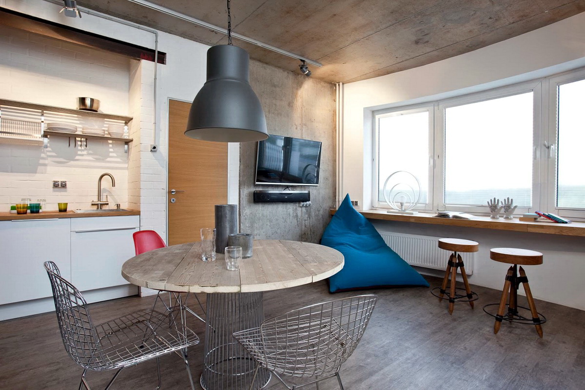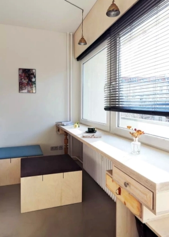 Unlimited space is opened by using the sill area as a dining table against a long wall.The option is ideal for a studio apartment.