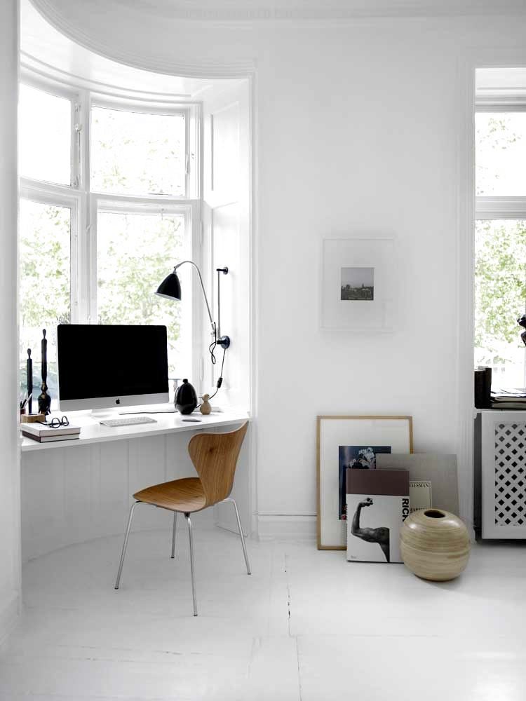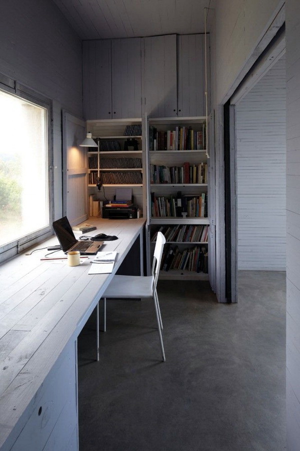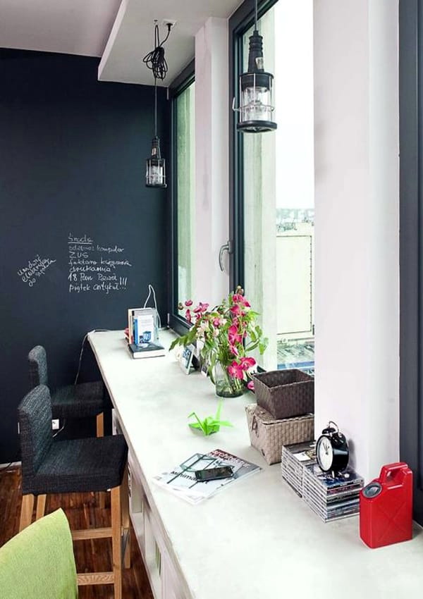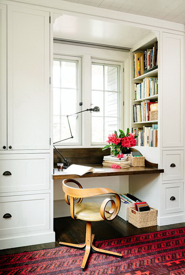 A bright embedded table is a good way to use the entire space. Even the small narrow areas of the tabletop and the corners, with proper sizing, become a stylish place for storing small things.