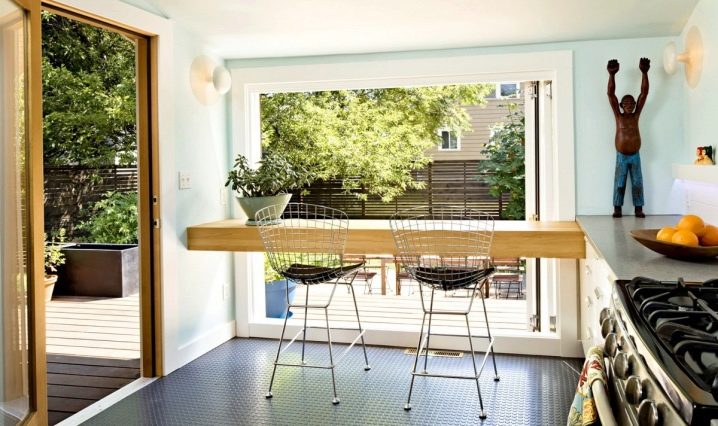 Rational use of space today takes almost every modern person. There is no need to litter the area of the apartment if there is a mass of methods for aesthetic and practical placement of furniture. Thus, the table-sill can organically complement the interior of the kitchen, living room, children's room and study. The design is a one-piece or two-piece hinged tabletop, placed along the window instead of a window sill.