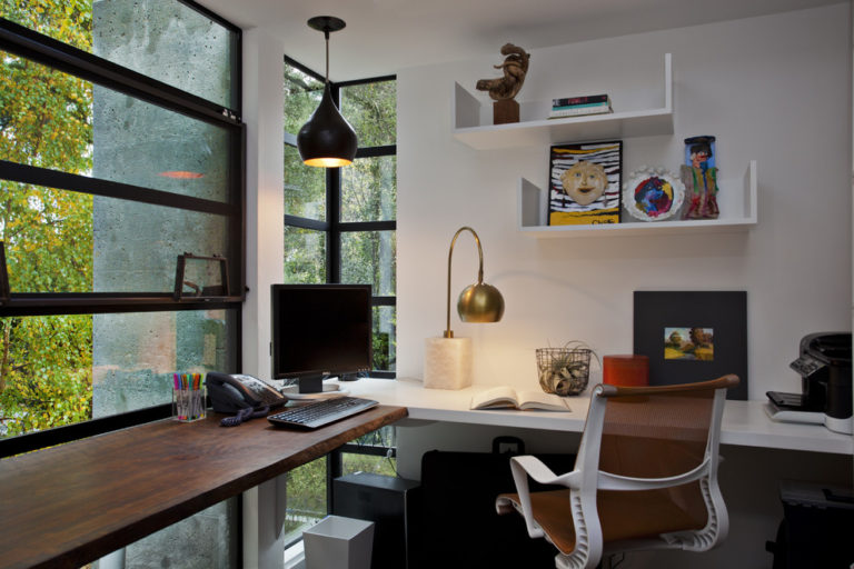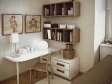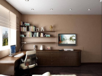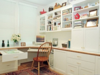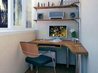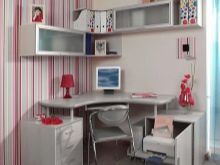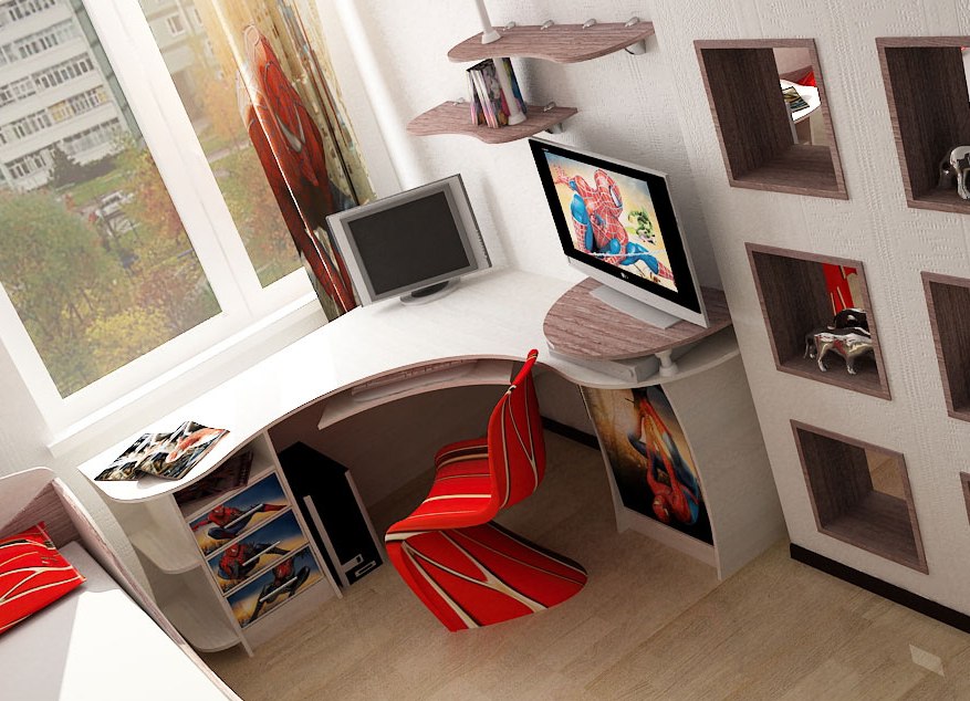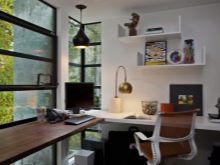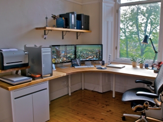 It is possible to put a comfortable corner table not only along the wall, but also across its entire height, by installing several corner wall shelves above the workplace. In such zones it will be most convenient to work and study, since all the necessary components can be located at hand.
